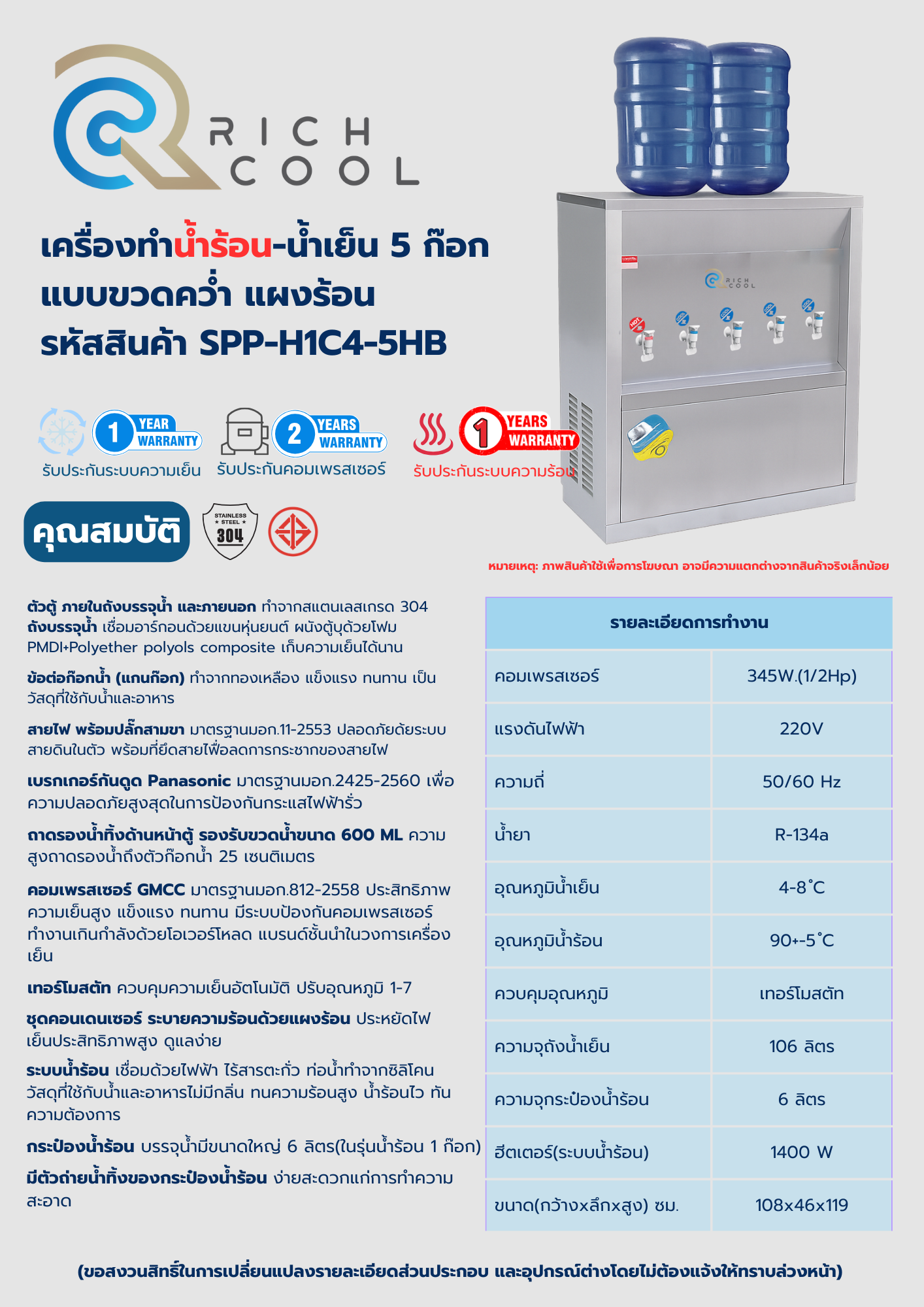 Rich Cool เครื่องกดน้ำเย็น 4 ก๊อก – น้ำร้อน 1 ก๊อก แบบขวดคว่ำ รหัสสินค้า SPP-H1C4-5HB
