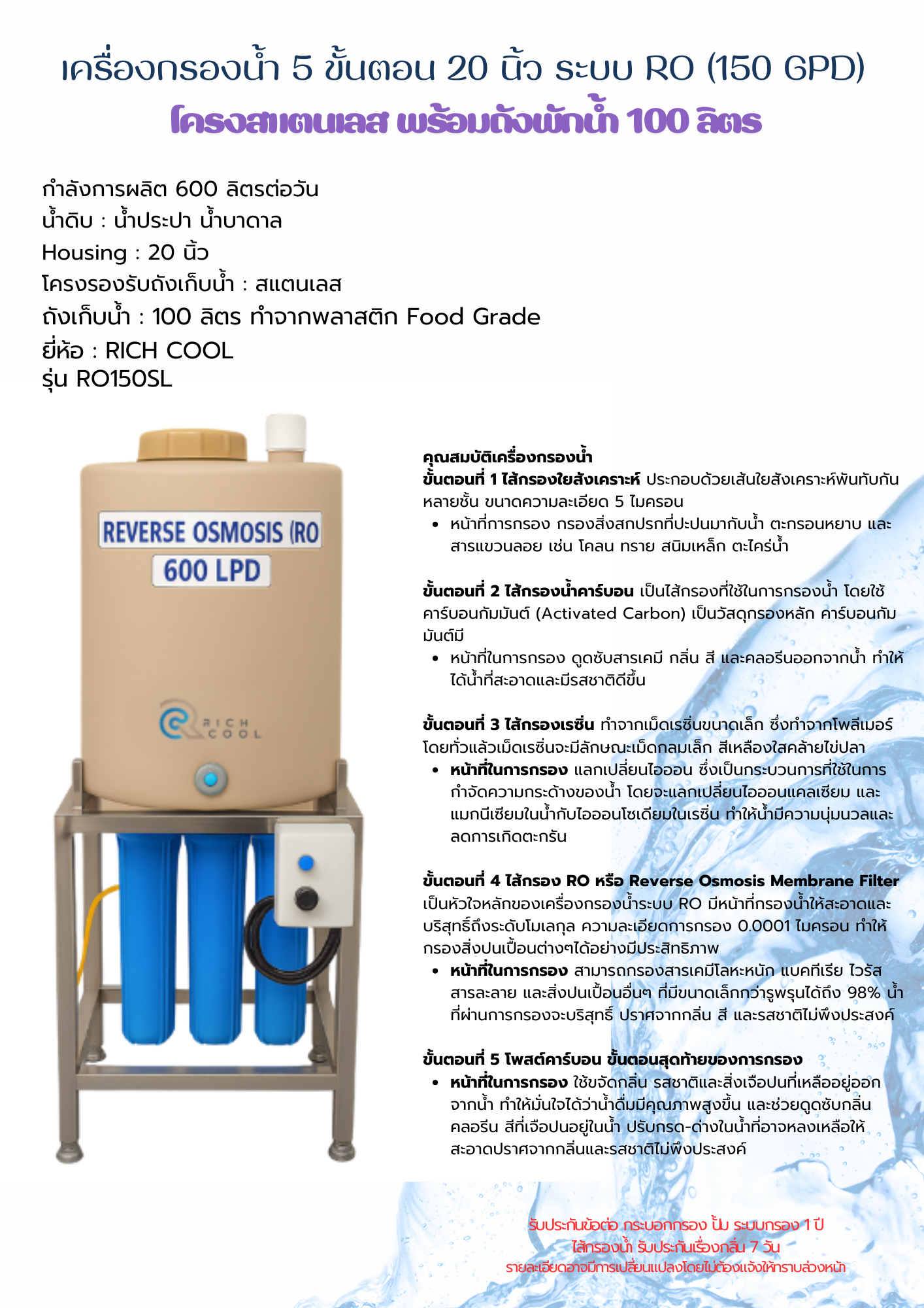 เครื่องกรองน้ำ 5 ขั้นตอน ระบบ RO 150 GPD พร้อมถังเก็บน้ำ 100 ลิตร