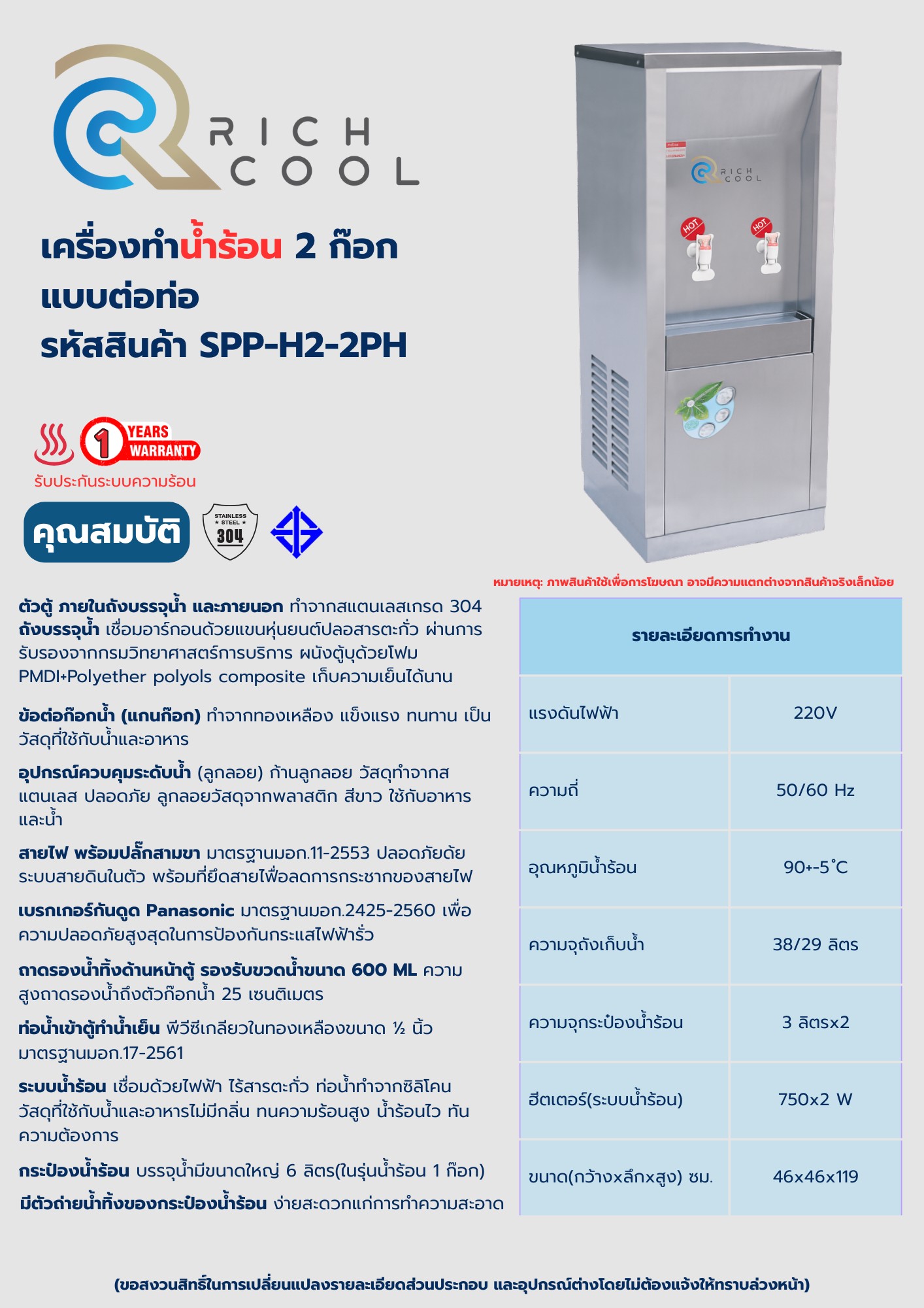 Rich Cool เครื่องทำน้ำร้อน 2 ก๊อก แบบต่อท่อ รหัสสินค้า SPP-2PH