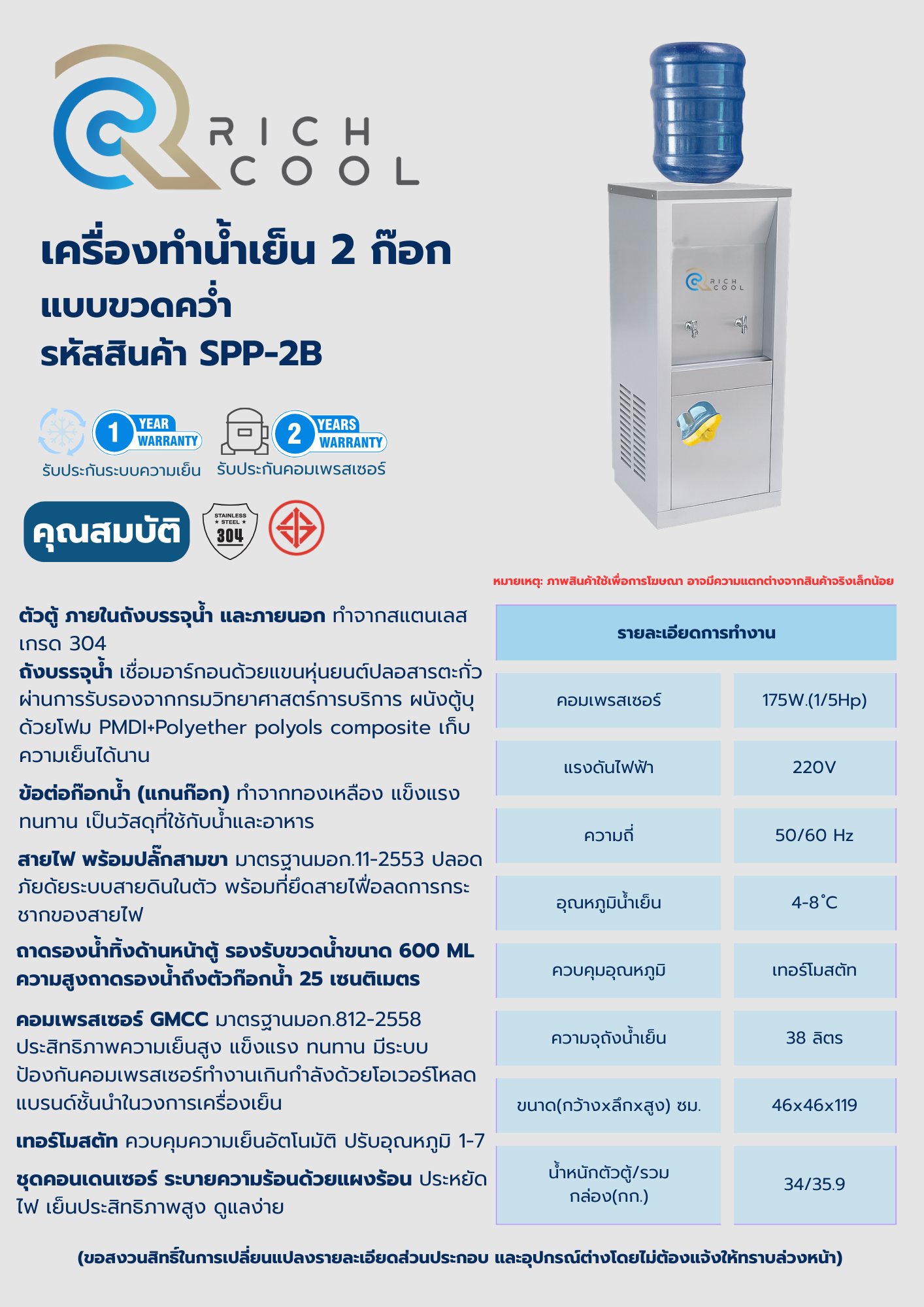 Rich Cool เครื่องกดน้ำเย็น 2 ก๊อก แบบขวดคว่ำ รหัสสินค้า SPP-2B
