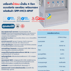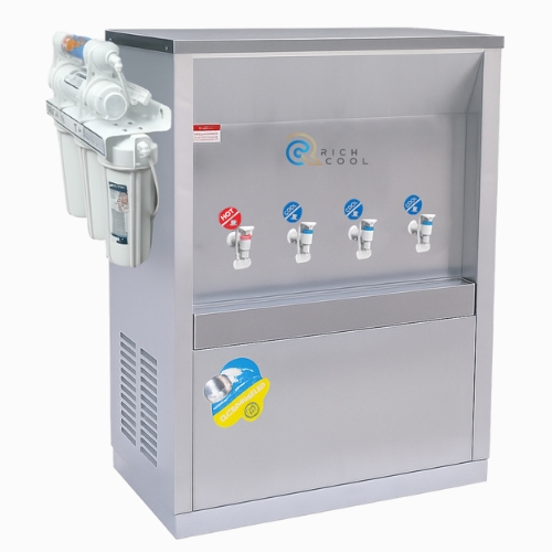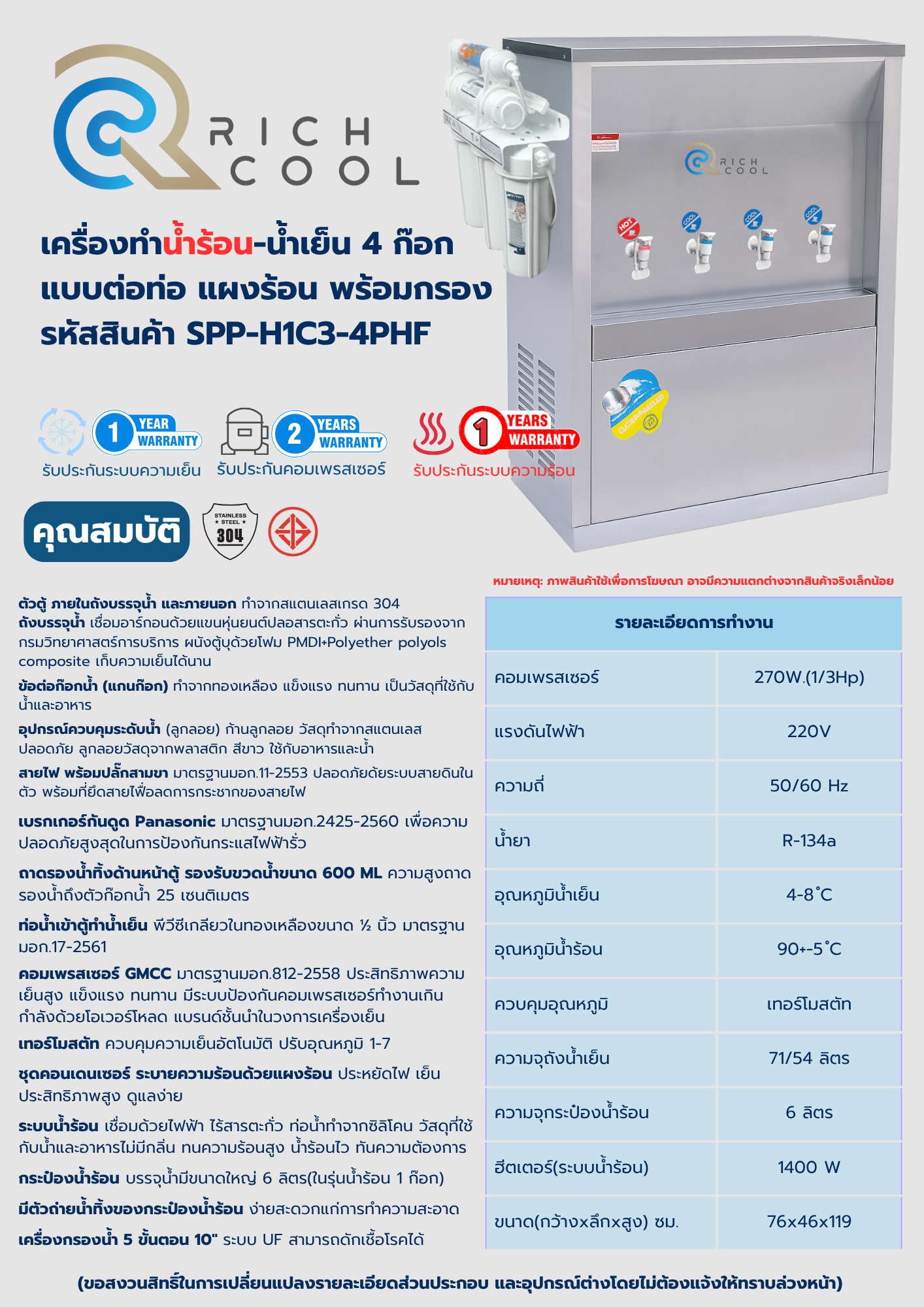 Rich Cool เครื่องทำน้ำร้อน 1 ก๊อก และน้ำเย็น 3 ก๊อก แบบต่อท่อ พร้อมเครื่องกรองน้ำ 5 ขั้นตอน รหัสสินค้า SPP-H1C3-4PHF