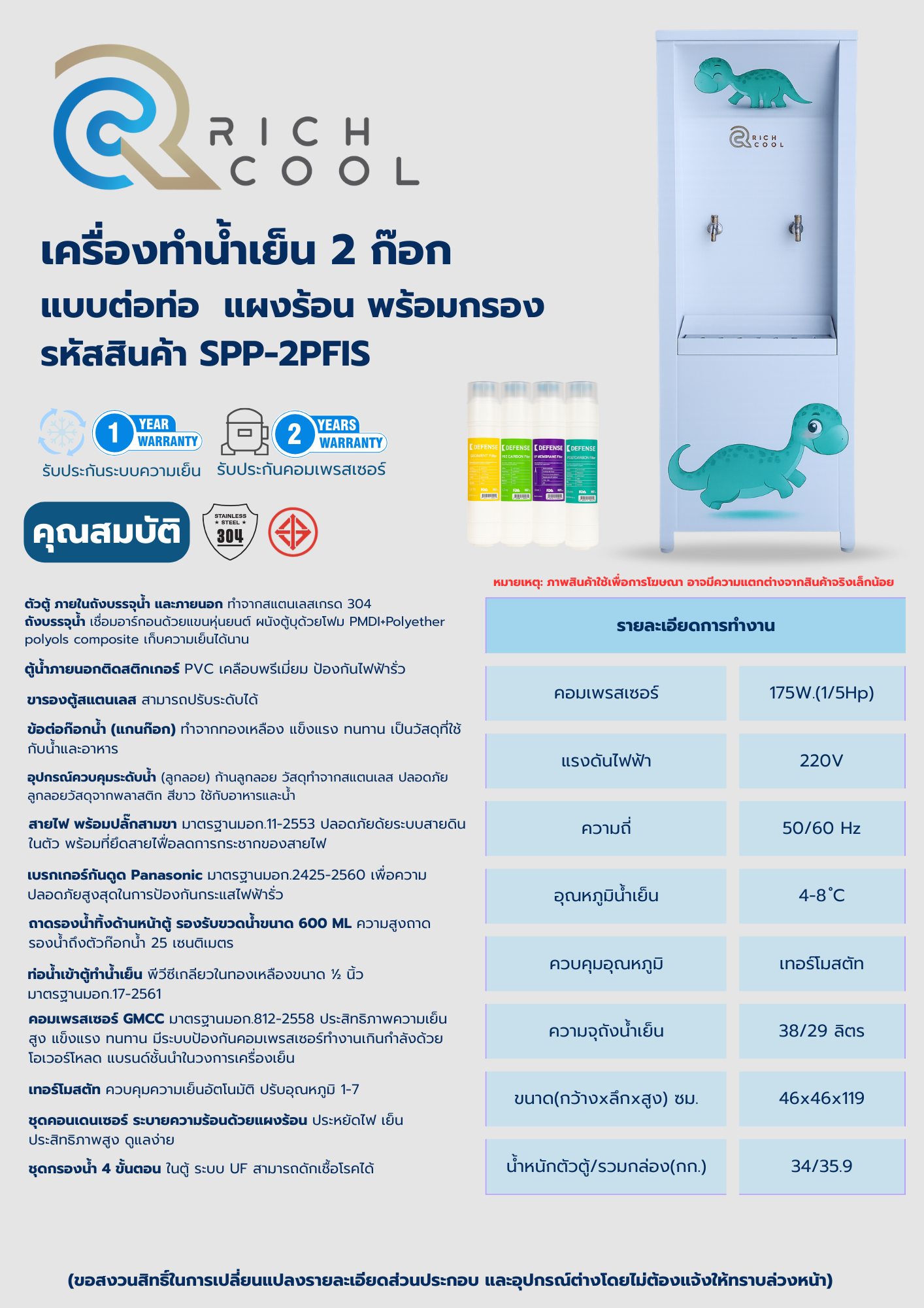 Rich Cool เครื่องทำน้ำเย็น 2 ก๊อก พร้อมเครื่องกรองน้ำ 4 ขั้นตอน UF รหัสสินค้า SPP-2PFIS