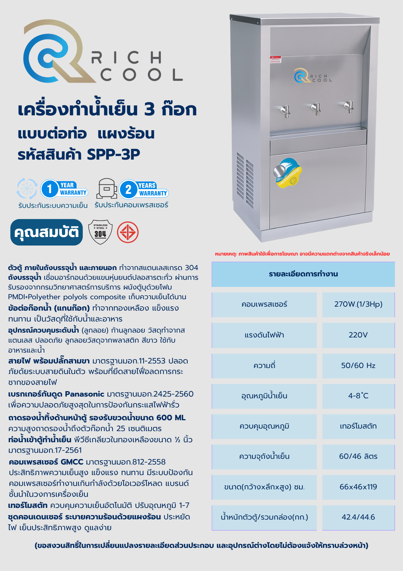Rich Cool เครื่องทำน้ำเย็น 3 ก๊อก แบบต่อท่อ รหัสสินค้า SPP-3P